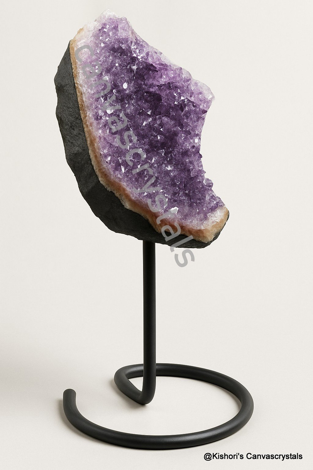 Elevate your space with the timeless elegance of Natural Amethyst Raw Clusters from Canvas Gemstone. Each cluster is a one-of-a-kind masterpiece, showcasing shimmering violet points in their natural form, beautifully displayed on a sleek black stand. • Size Options :
