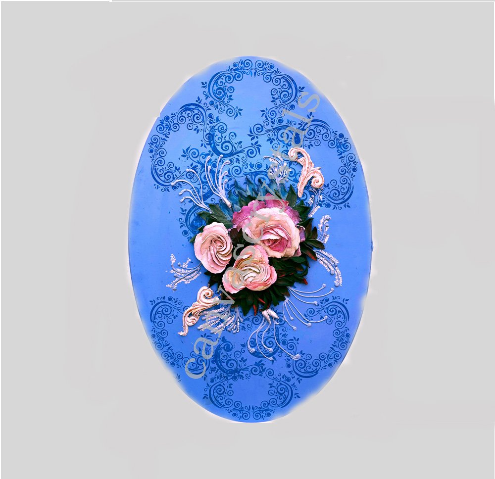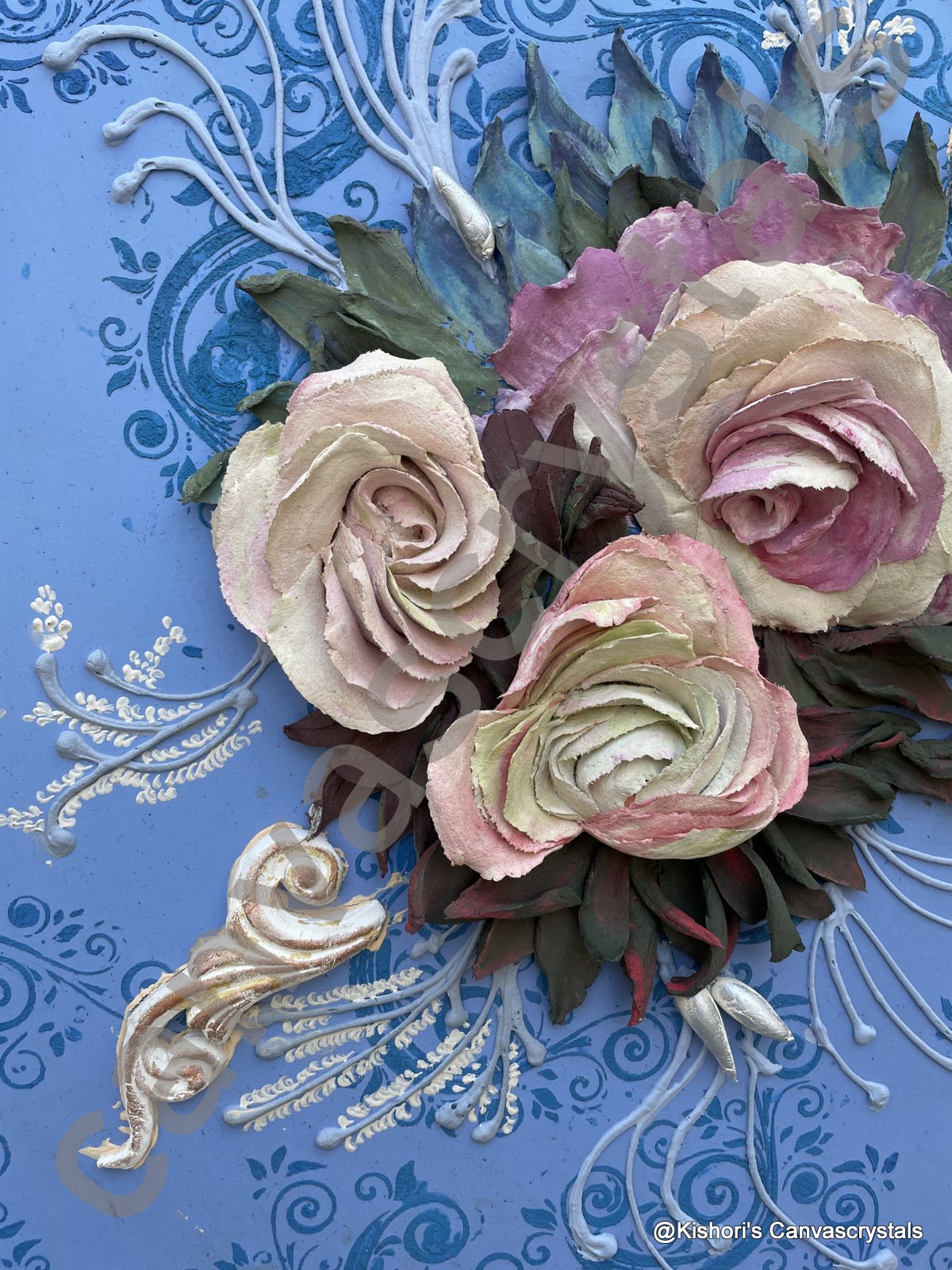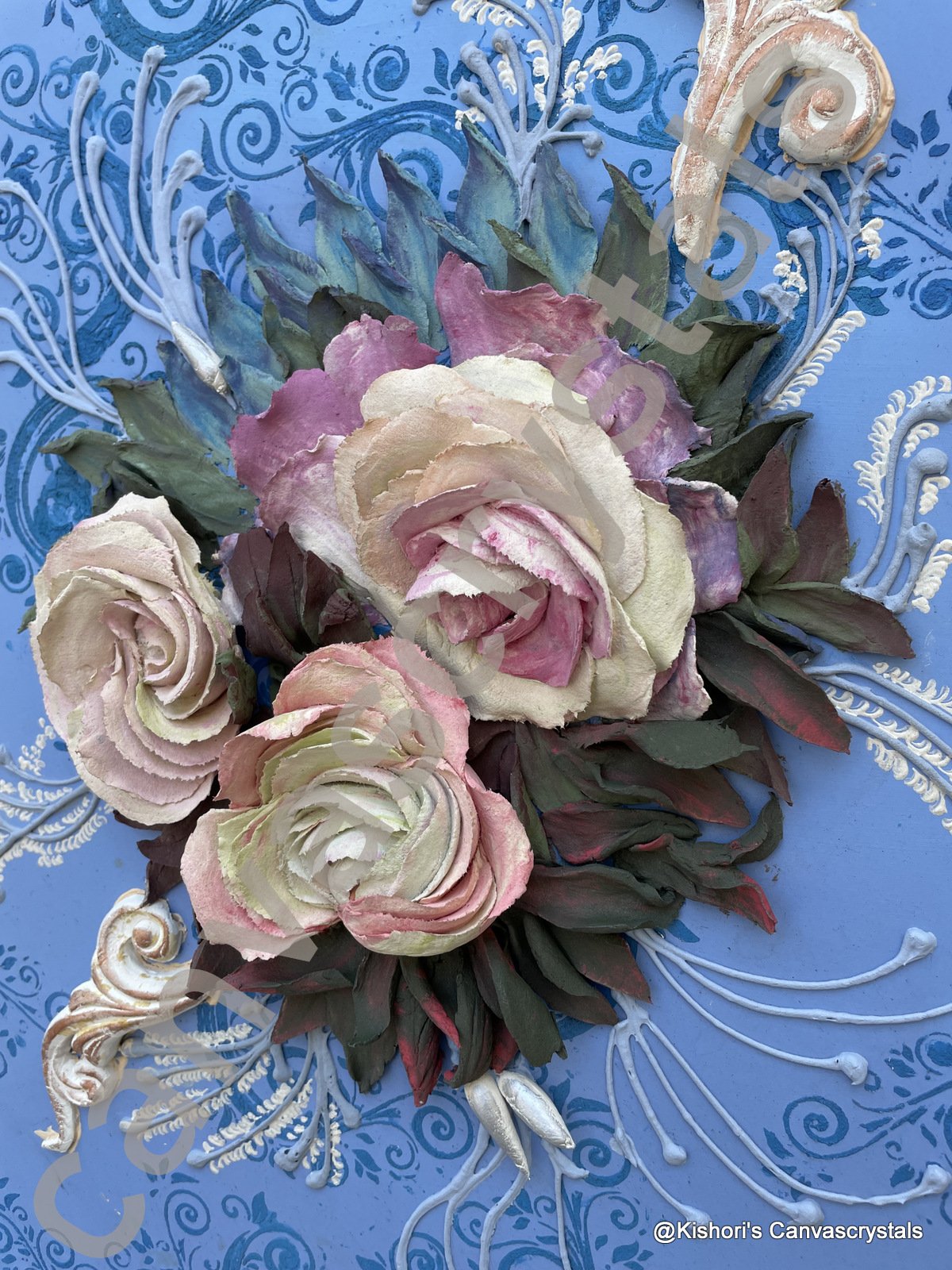 Forest Roses is a premium collectible 3D sculpture painting crafted on a 27” x 18” oval wood base, featuring meticulously sculpted forest-hued roses in cream, blush, and mauve. Surrounded by hand-painted botanical flourishes in metallic gold and soft silver, the composition blooms from a serene ocean-blue backdrop with intricate stencil details. Each petal is individually sculpted, painted, and placed to create a lifelike, layered effect that invites both touch and admiration. Ideal for statement walls, luxury living rooms, boutique interiors, or grand gifting. Mounted: Ready to hang • Note : Symbolism and color-wellness are inspirational, not medical claims