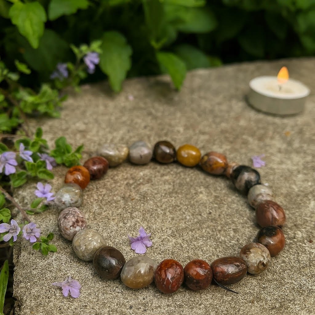 Handcrafted with authentic tumbled Mexican Lace Agate beads, this bracelet radiates natural beauty with its earthy browns, warm reds, golden ambers, and soft greys. Known as a stone of balance and positivity, Mexican Lace Agate helps stabilise emotions, encourage optimism, and support grounding energy. Each bead is unique, reflecting nature’s artistry. Perfect for meditation, daily wear, or spiritual growth. Colors: Warm red, golden amber, earthy brown, soft grey, cream. 🌿 Mexican Lace Agate Tumbled Bracelet – Wear nature’s harmony every day.