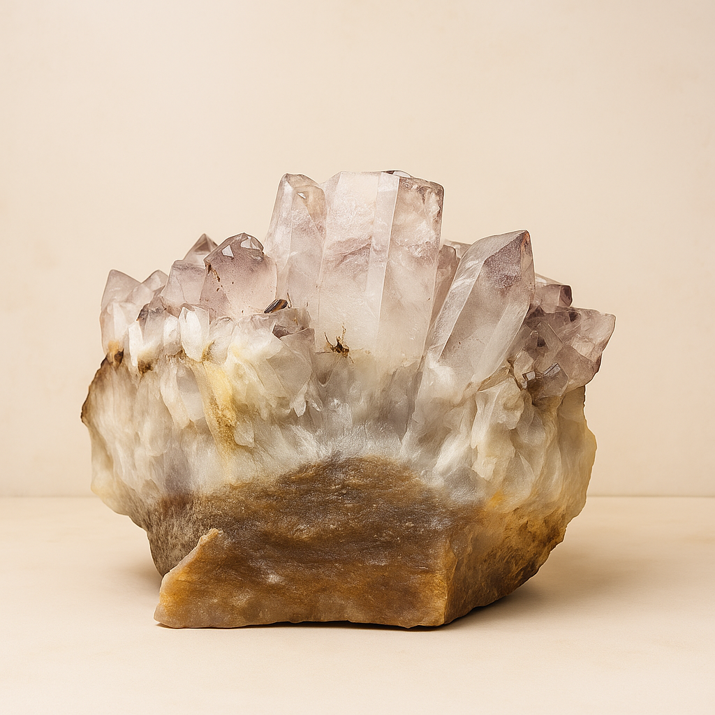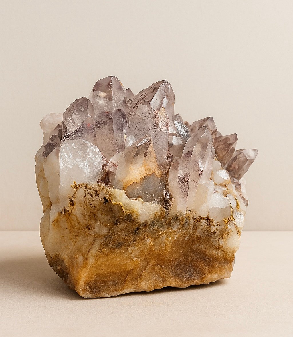 This Natural Phantom Quartz Raw Cluster (1.02 kg) displays beautiful multi-layered phantom formations rising through clear and smoky Gemstone points. Its earthy gold-brown matrix and gentle gradient of transparent-to-shadowed quartz create a powerful visual presence—perfect for collectors, décor lovers, and intention-based spaces. Phantom quartz is admired globally for its symbolic themes of growth, inner evolution, new beginnings, and layered clarity, making it a meaningful centrepiece for living rooms, studios, meditation corners, and work desks. Each point captures light in a unique way, reflecting soft beige, white, smoky, and amber undertones. This piece is naturally mined, untreated, and one-of-a-kind. 📦 Worldwide Delivery – India / US / UK
