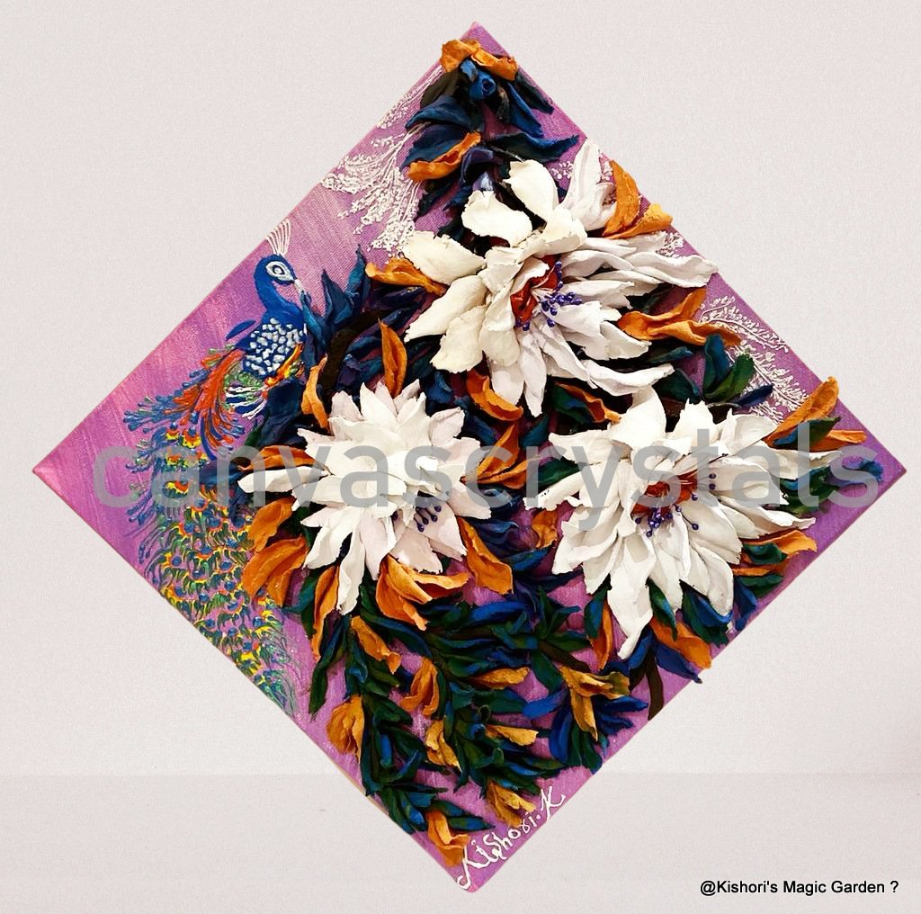 Immerse yourself in the royal elegance of a hand-crafted sculpture painting that blends textured artistry with vibrant symbolism. This unique creation features blooming white Penhill Watermelon dahlias sculpted in deep relief against a rich purple backdrop, adorned with a regal peacock in intricate hues of blue, teal, and gold. Every petal is hand-formed, painted, and arranged to create a lifelike three-dimensional effect, making it a true collector’s piece. Perfect for luxury home décor, art gifting, or statement wall displays. Symbolically, peacocks represent beauty, vision, and grace, while dahlias embody inner strength and elegance. Peacocks symbolize grace and prosperity, while dahlias inspire inner strength and beauty. Pricing excludes domestic shipping. Note : Symbolism and color-wellness are inspirational, not medical claims