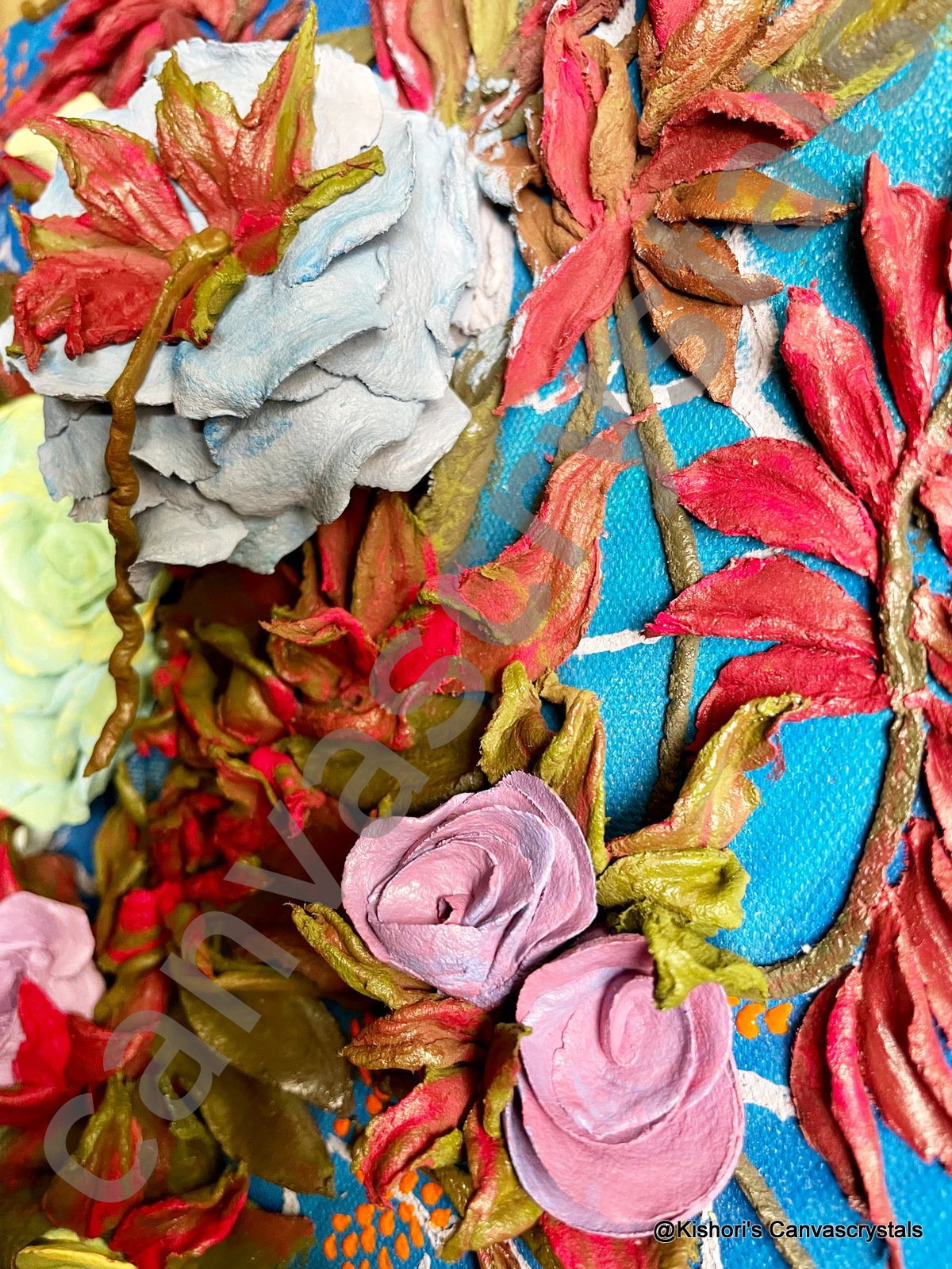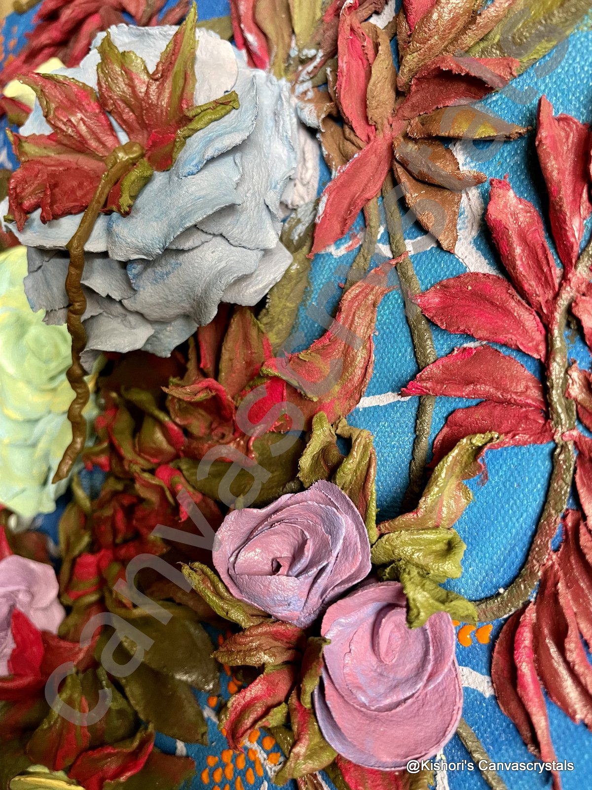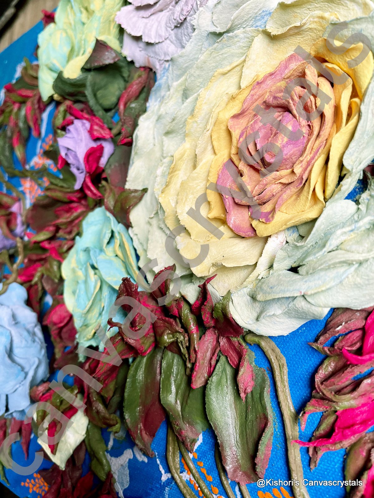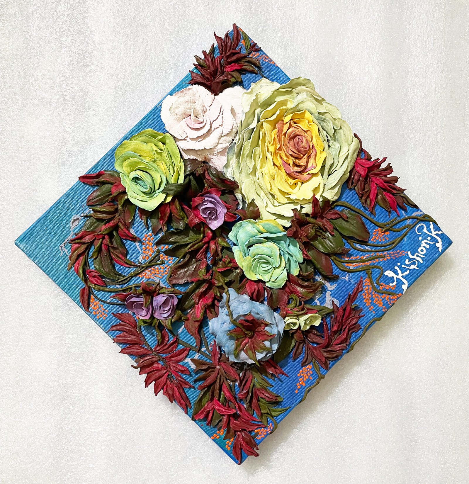 elegance to life. Each petal, from the largest yellow bloom to the tiniest rosebud, is hand-sculpted with precision using premium sculpting paste, creating a garden-like texture you can both see and feel. Set against a textured blue backdrop, the contrast of warm florals and bold botanical tones makes this piece ideal for both contemporary and sacred spaces. It’s a compact yet statement-worthy creation that transforms any wall with grace and serenity.